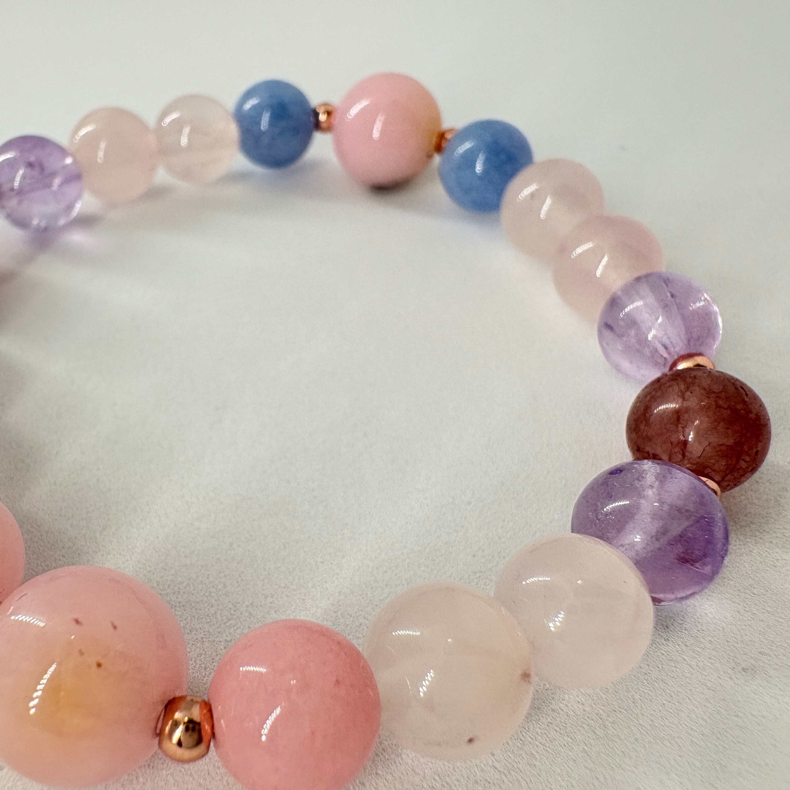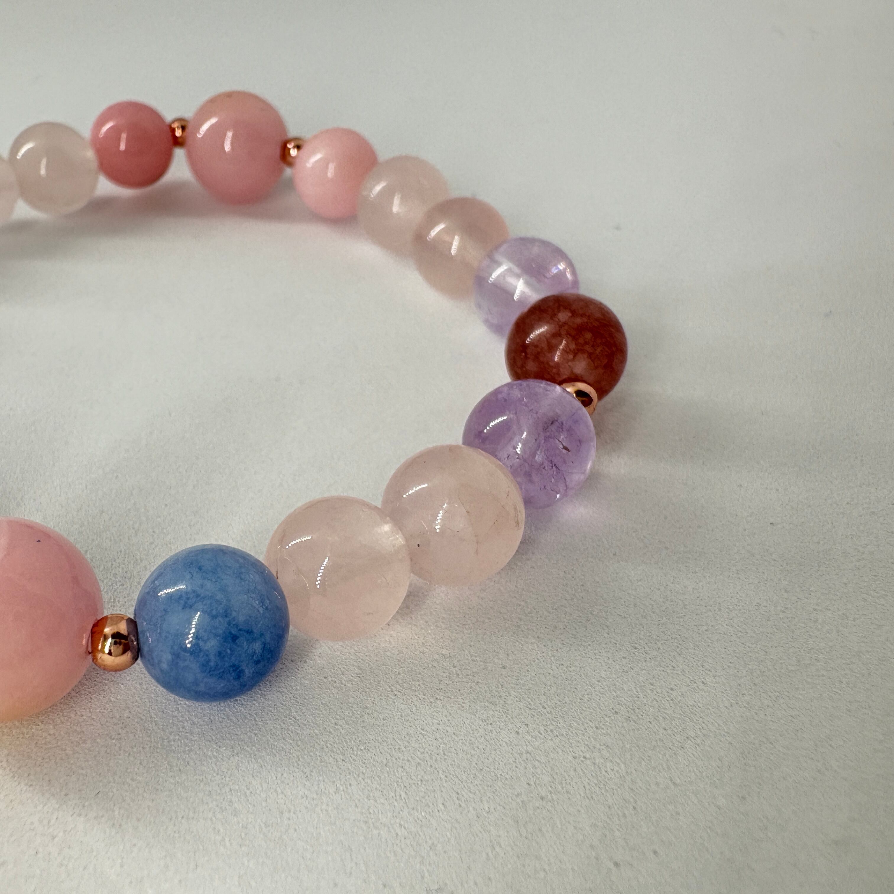 淡い桜色と優しいピンクが織りなす、春の訪れを感じさせるブレスレットです。