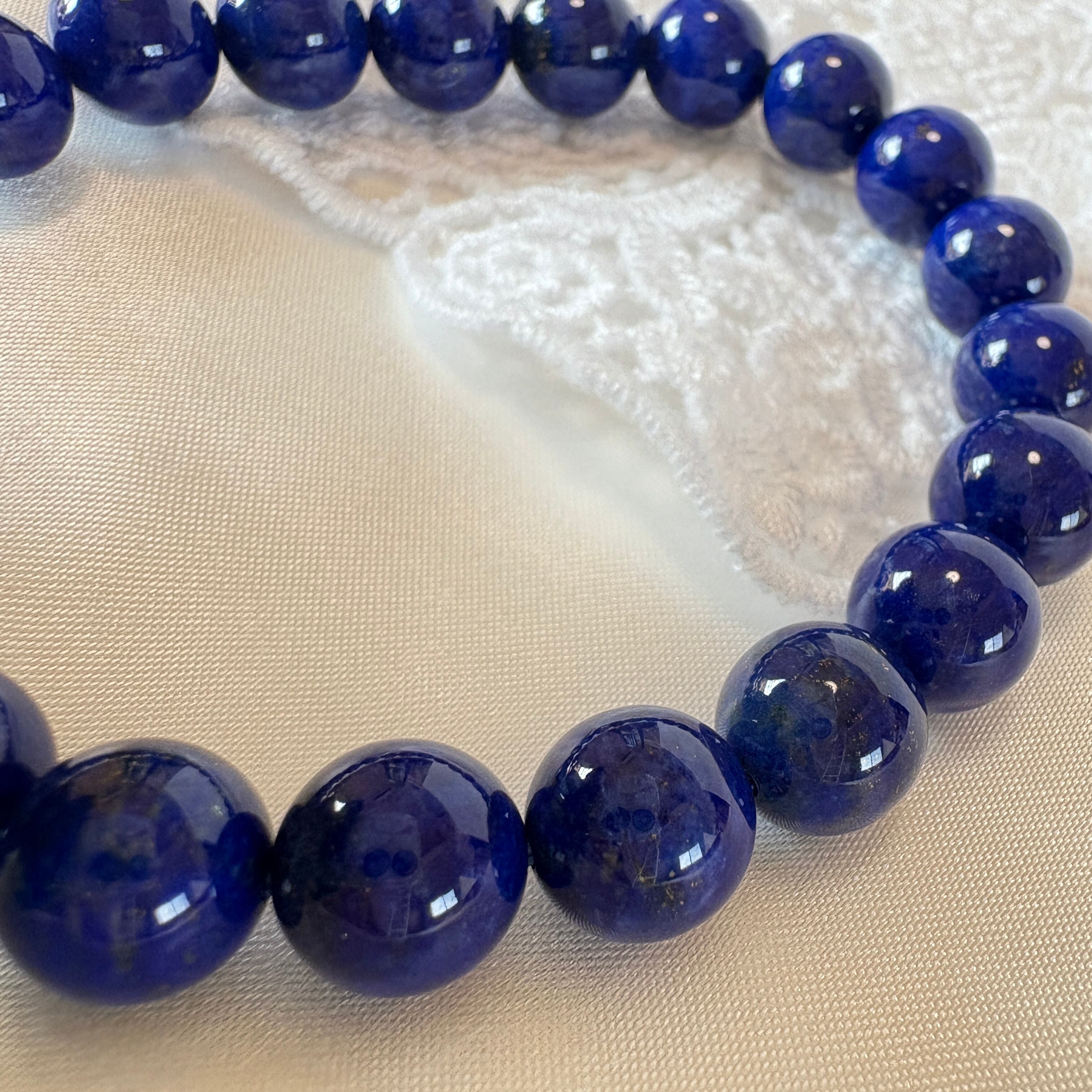 ✨本作は内周16cm、9㎜珠を使用したちょうどいいサイズ感。しっとりとした質感と深遠なブルーは、高品質天然 本物 無着色 無加工 無処理ラピスならではの気品を放ちます。手元を華やかに飾るだけでなく、持ち主の心に静けさと確信をもたらすお守りとしても最適です。