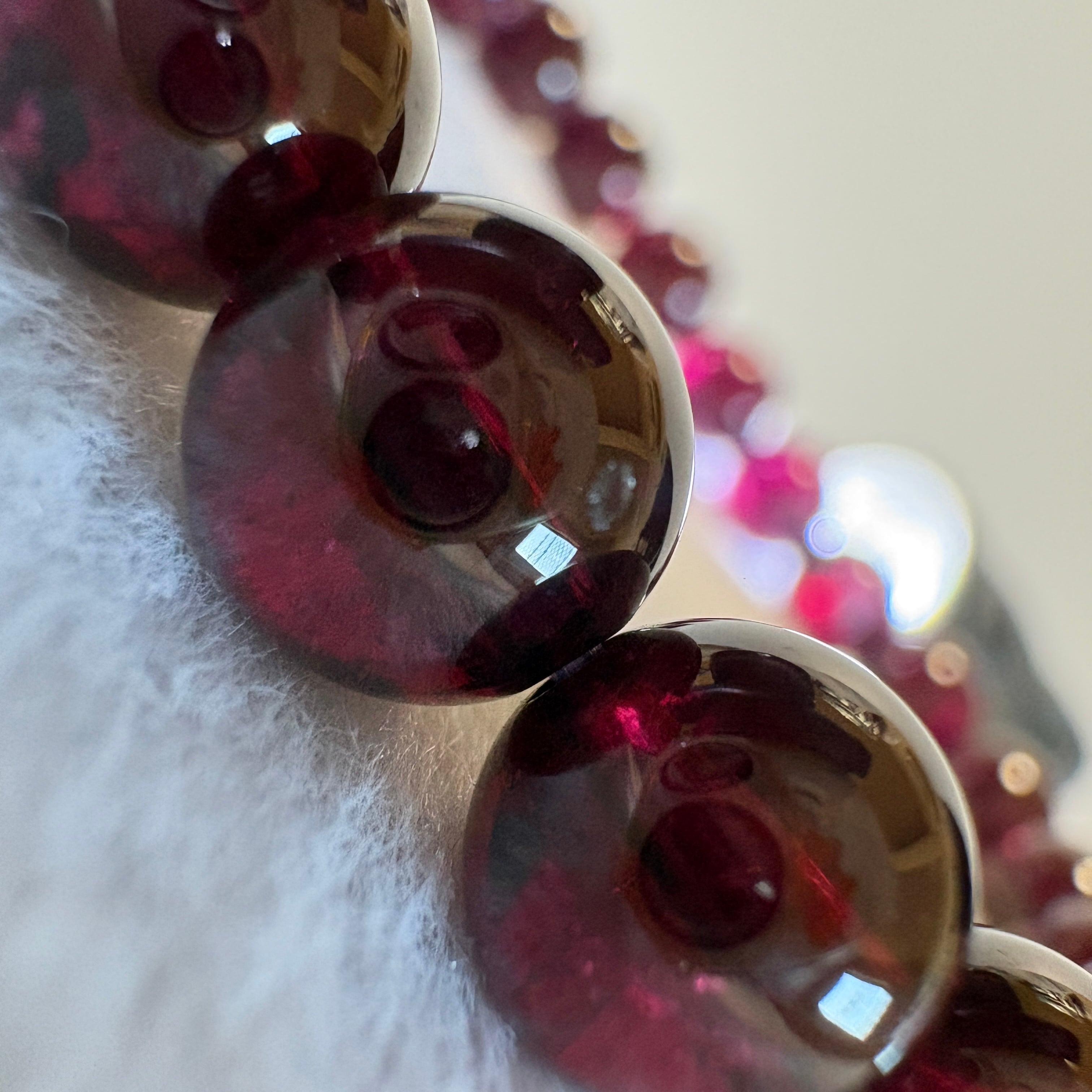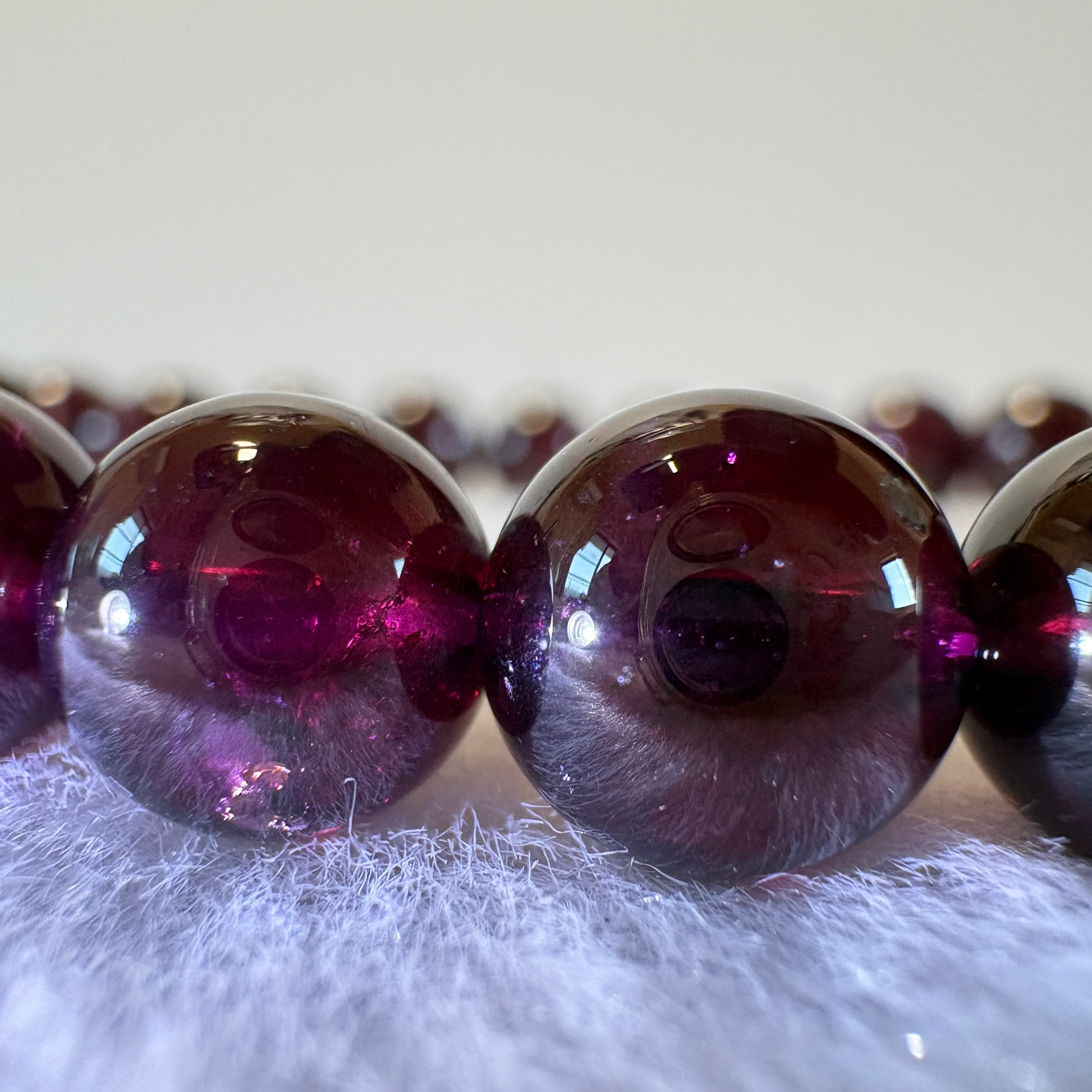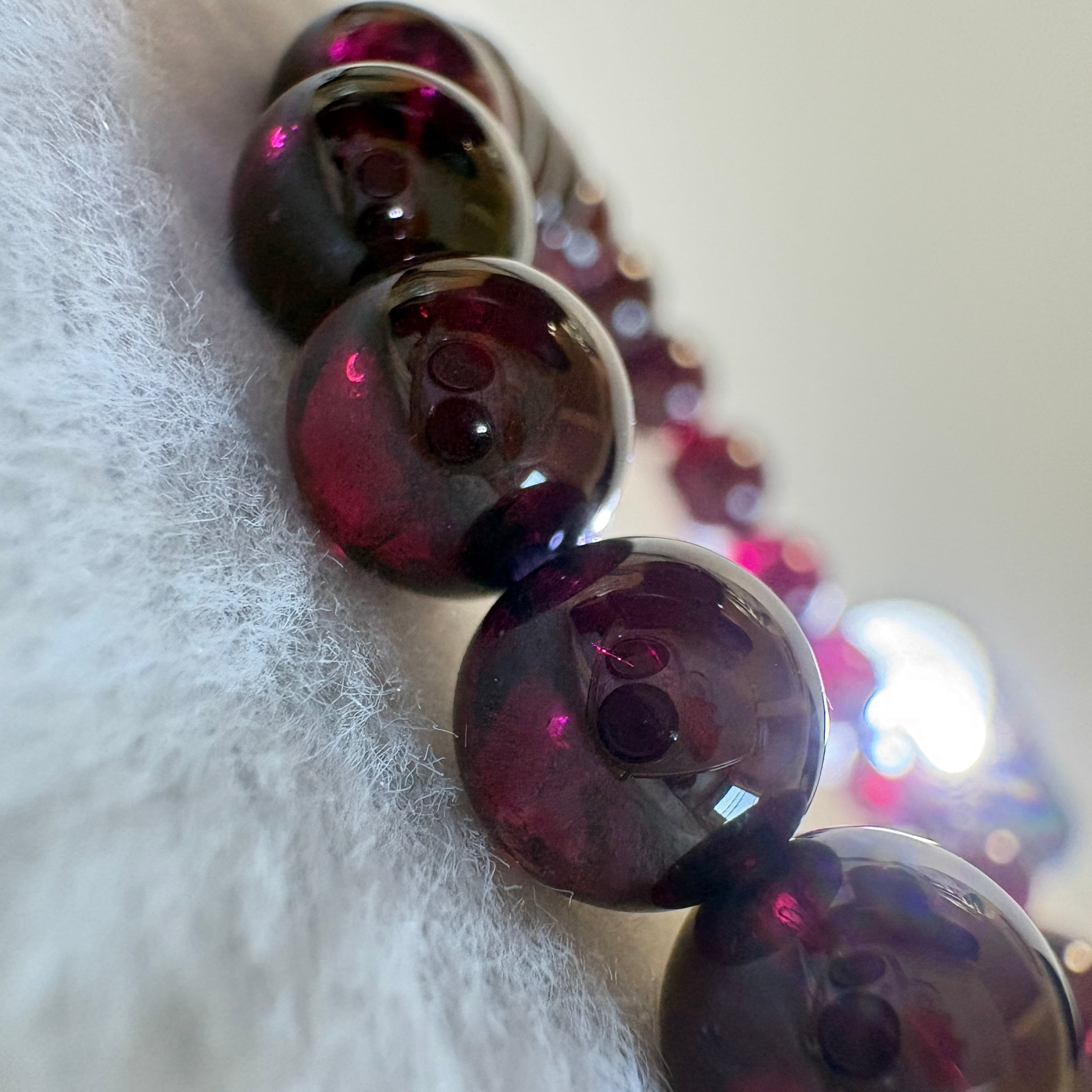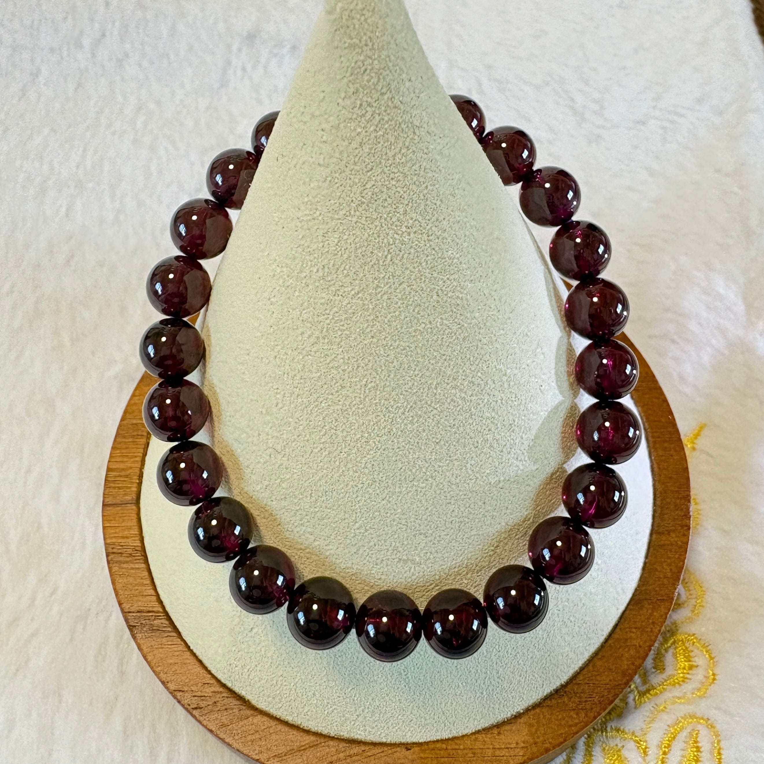 【1点もの】1月の誕生石・マラヤガーネットを使用したタンザニア産7.5mmブレスレット。赤紫に変化する希少ガーネットが、情熱と前向きな変化を象徴します。