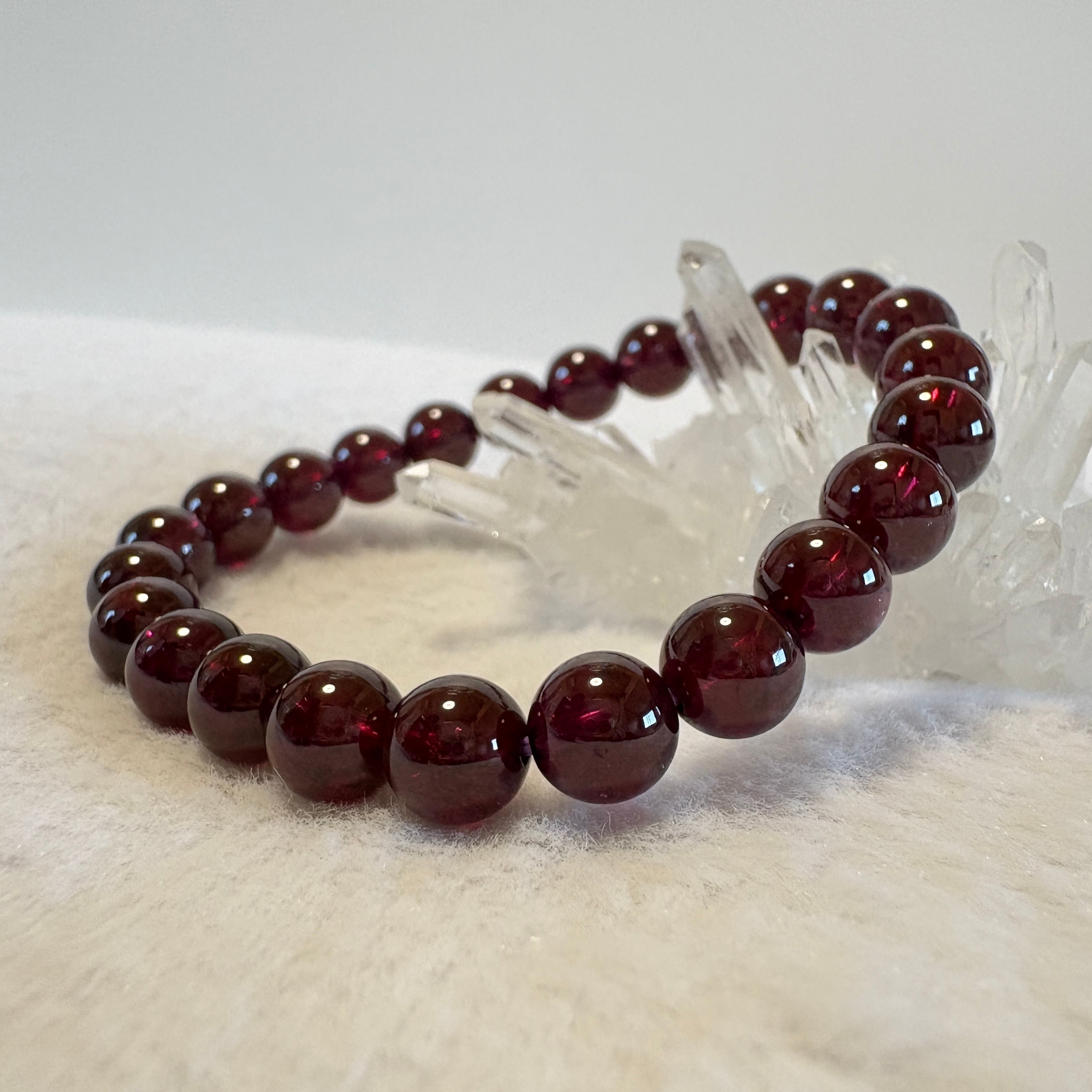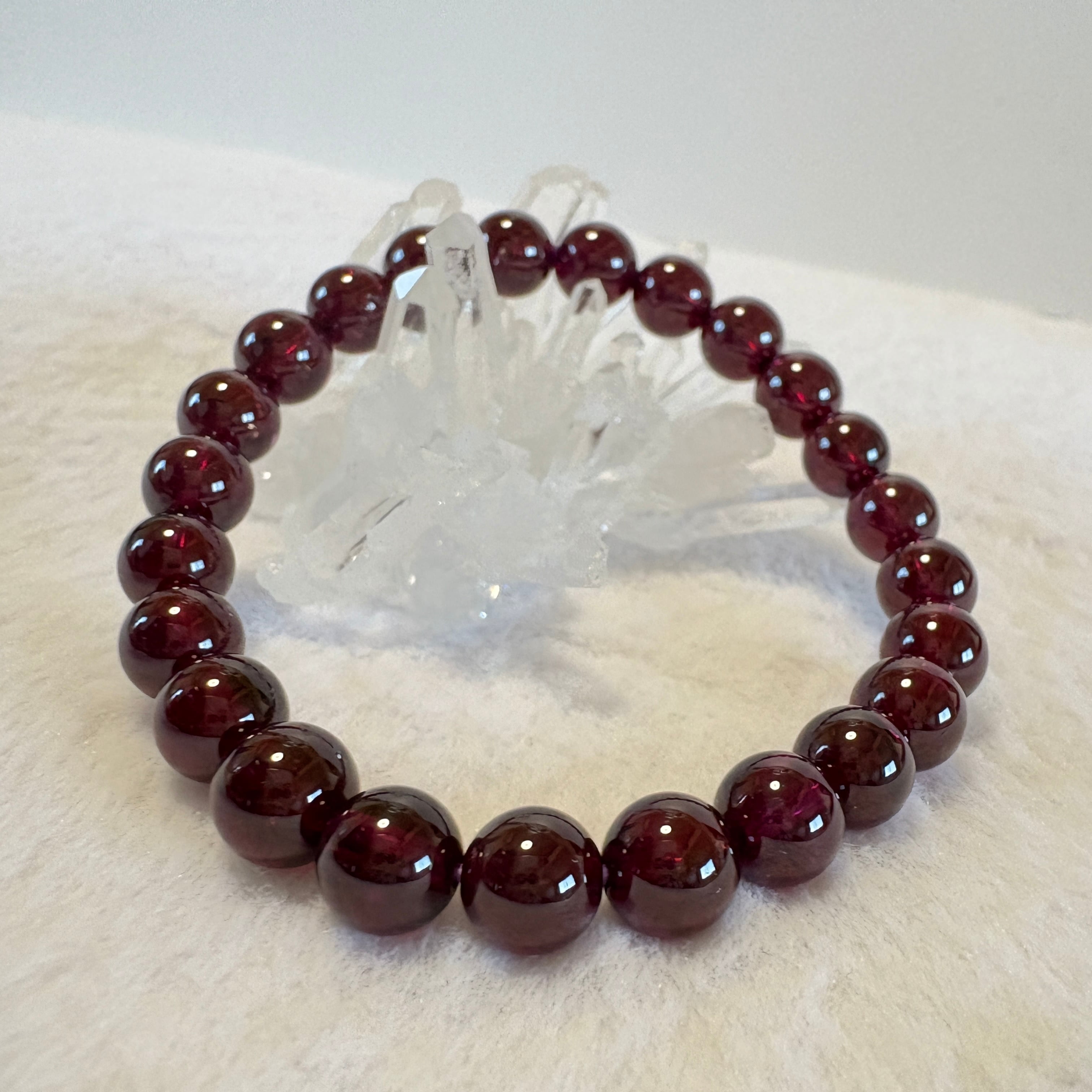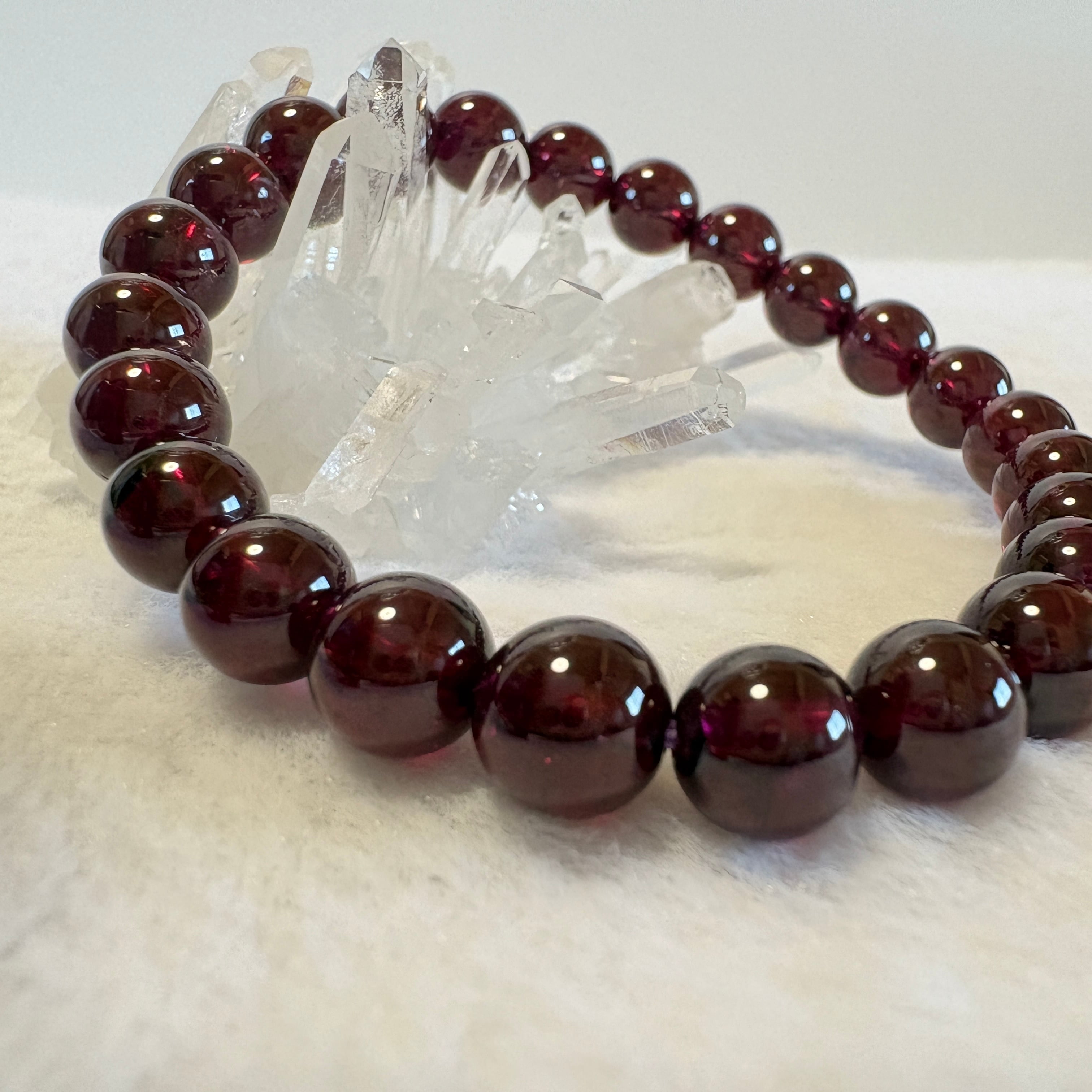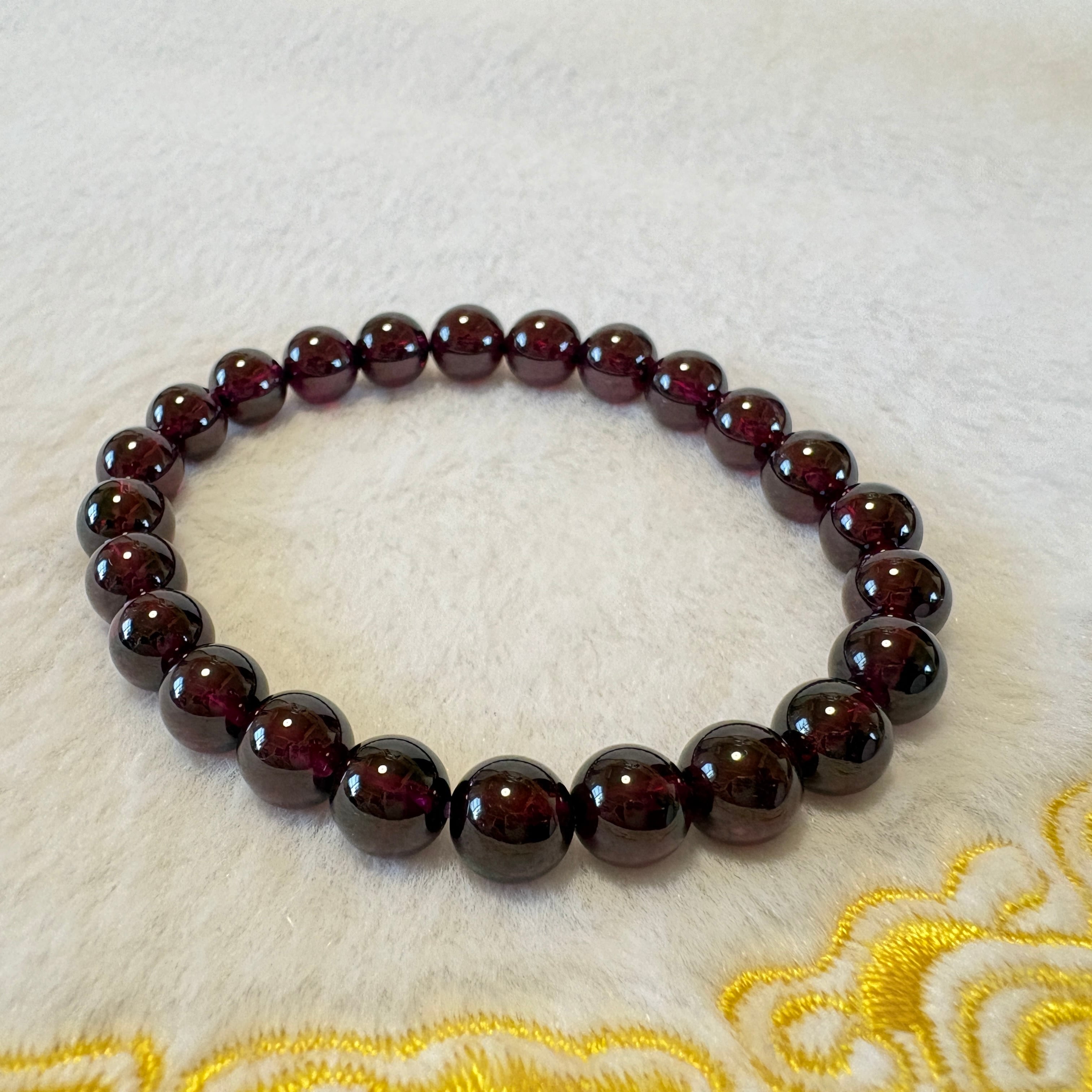 1月の誕生石として人気のマラヤガーネット7.5mmブレスレット。タンザニア産の希少ガーネットを使用し、情熱・再生・新しい始まりをサポートします。