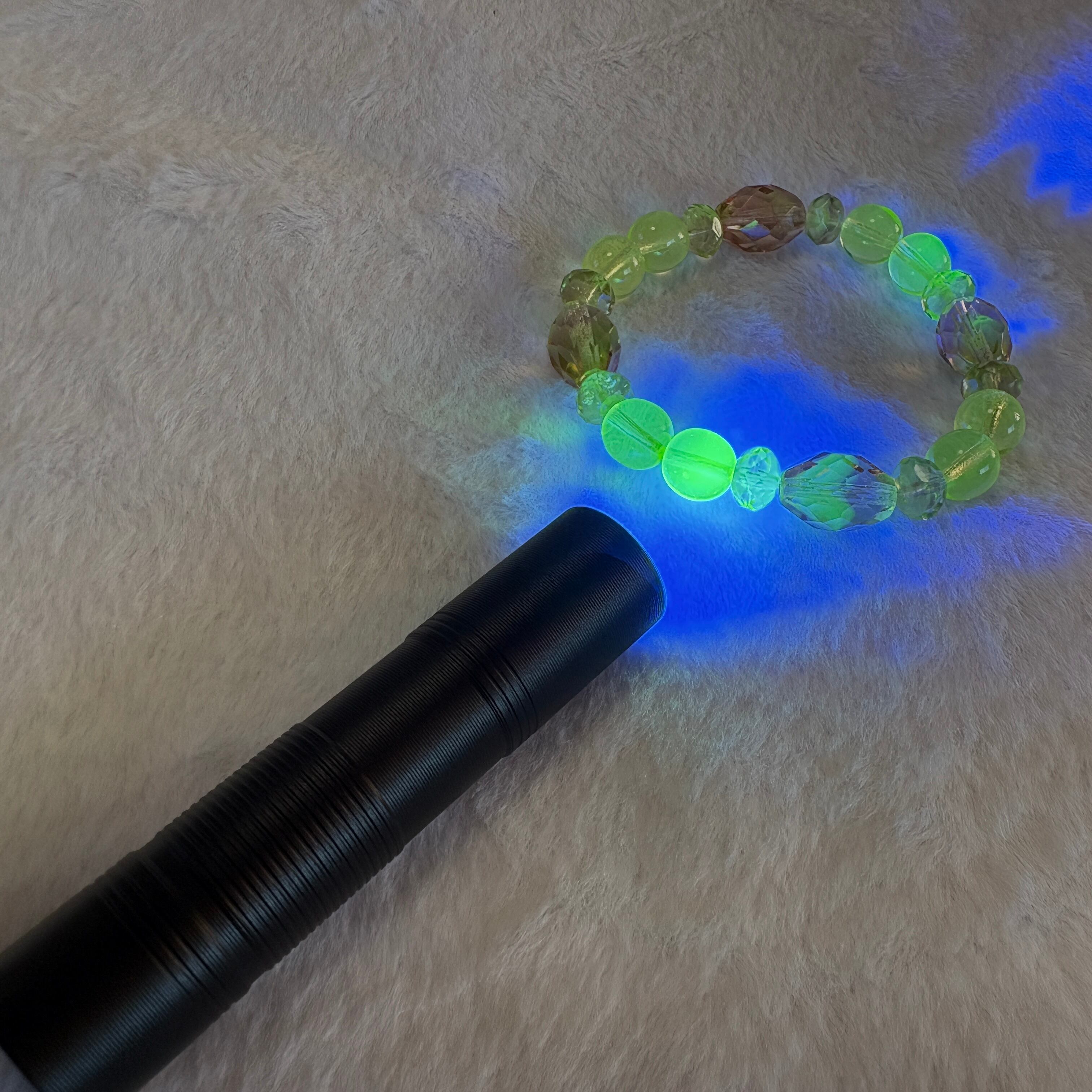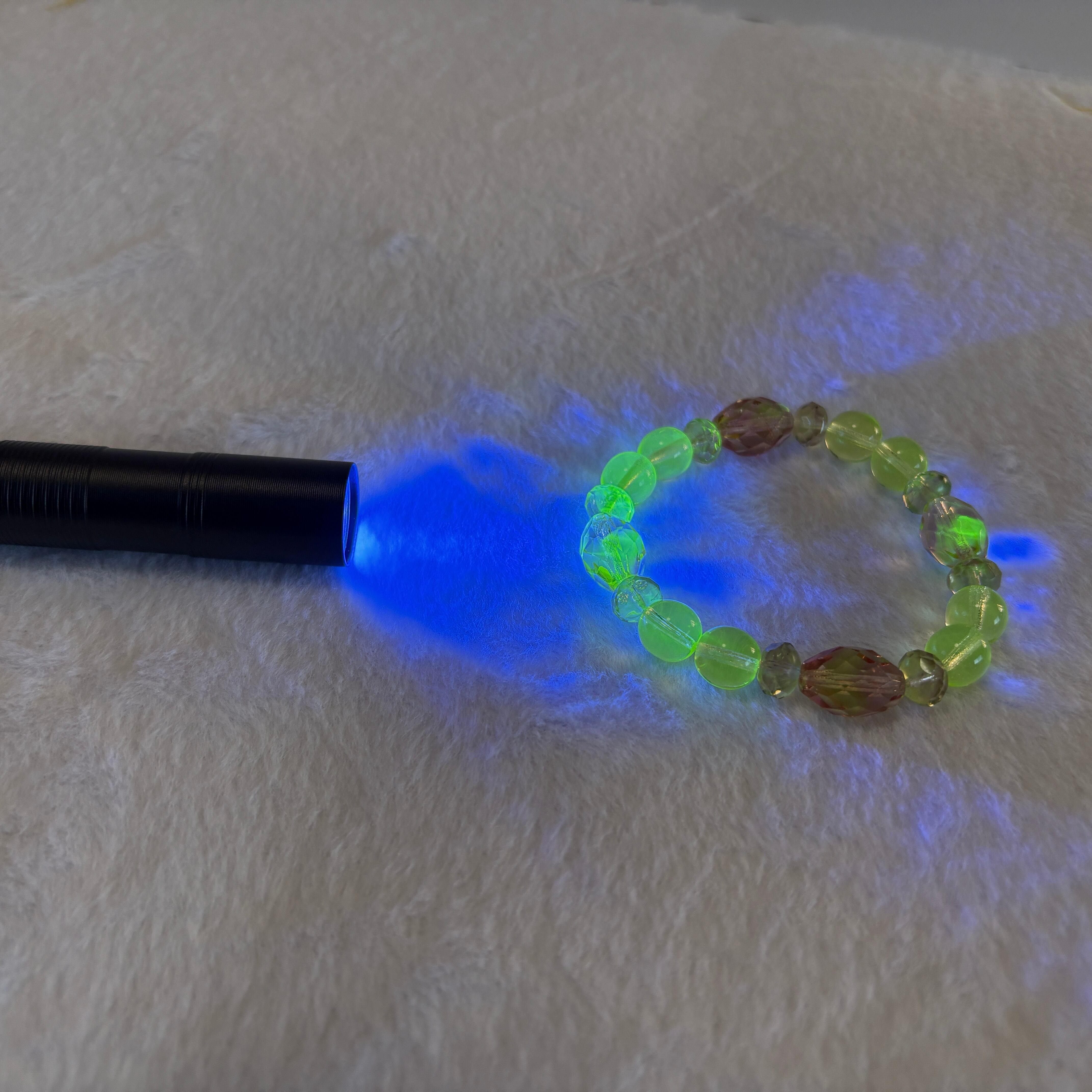 チェコ産ウランガラスの一点ものブレスレット。落ち着いた色合いとUV発光の美しさ。鑑賞用ライト付属。
