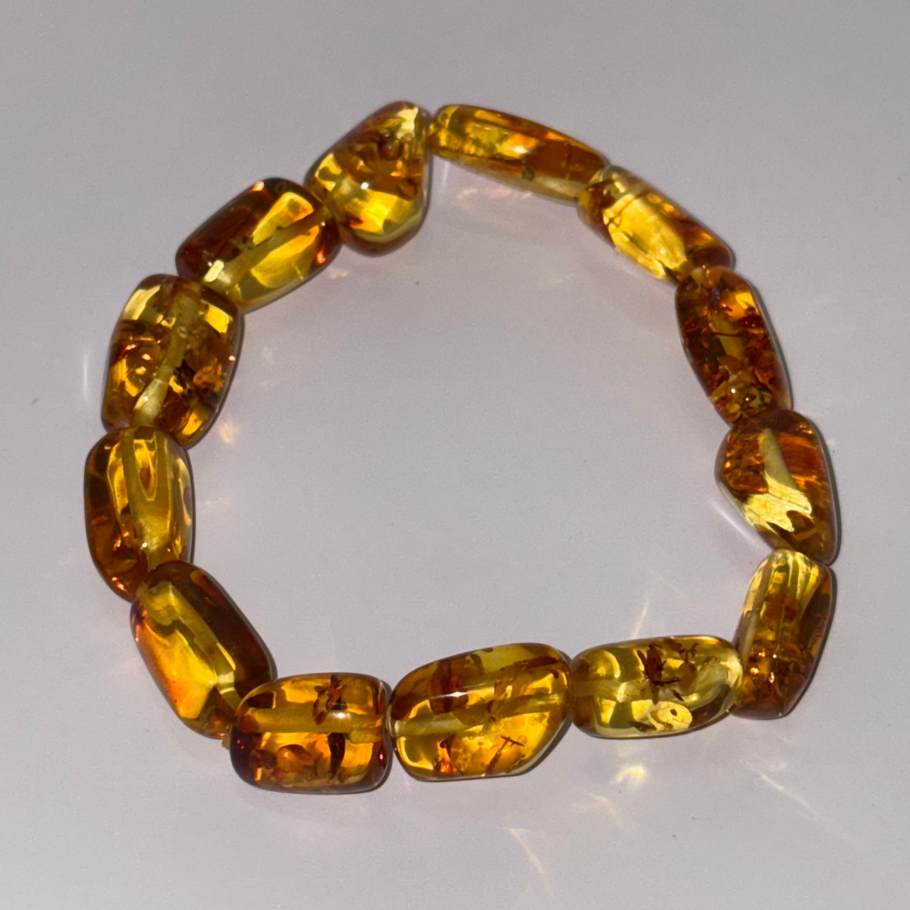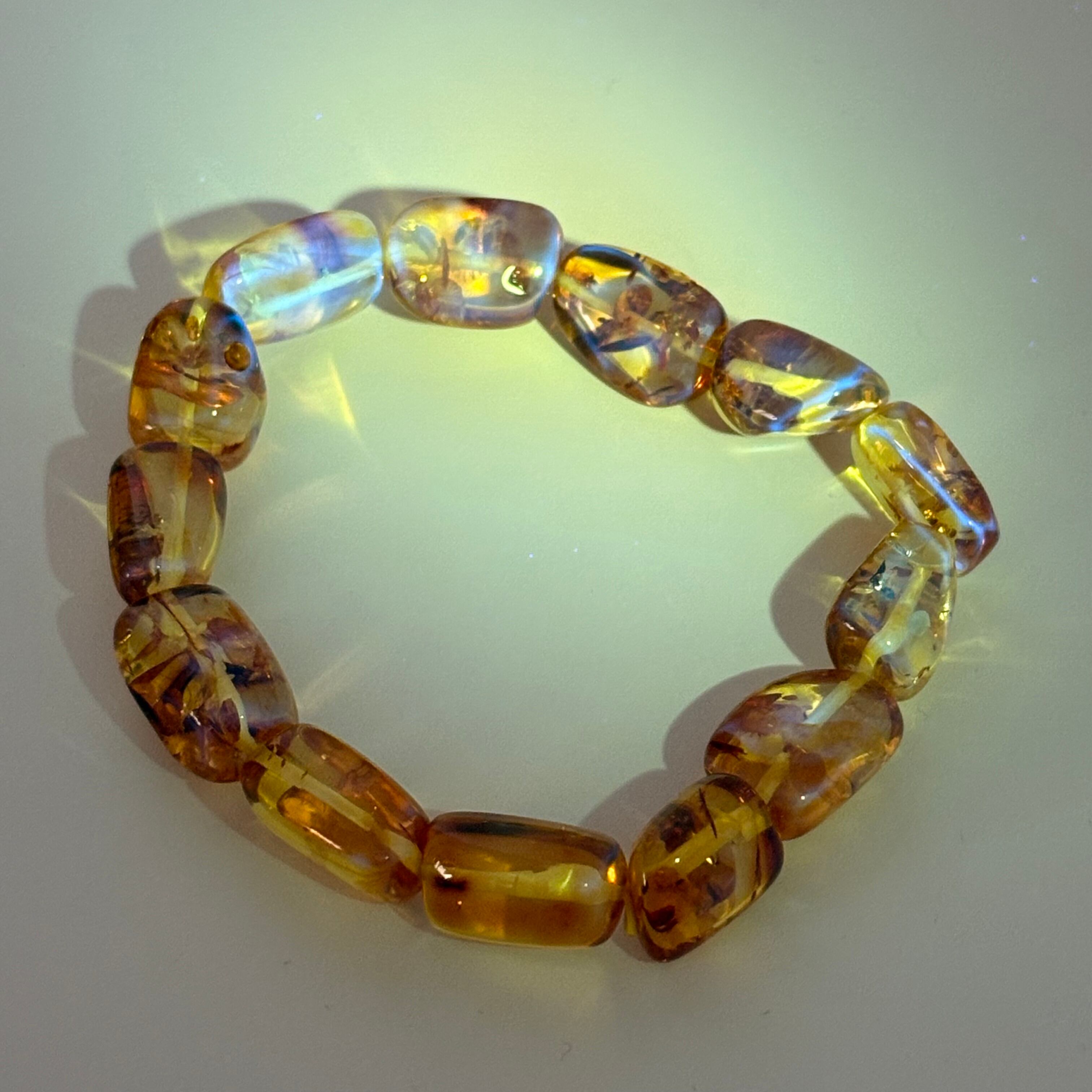 琥珀(アンバー)は、数百万年以上前の樹脂が化石化したもので、鉱物ではなく有機物の一種です。そのため、他の宝石とは異なり、温かみのある軽い質感を持ち、優しいエネルギーを放つことで知られています。古代から「太陽の石」として崇められ、幸運や健康をもたらすお守りとして愛されてきました。 特にヨーロッパやアジアでは、病気を防ぎ、生命力を高める力があると信じられています。画像の最後はUVライト(ブラックライト)を当てました。青く光るのは本物の証しです。