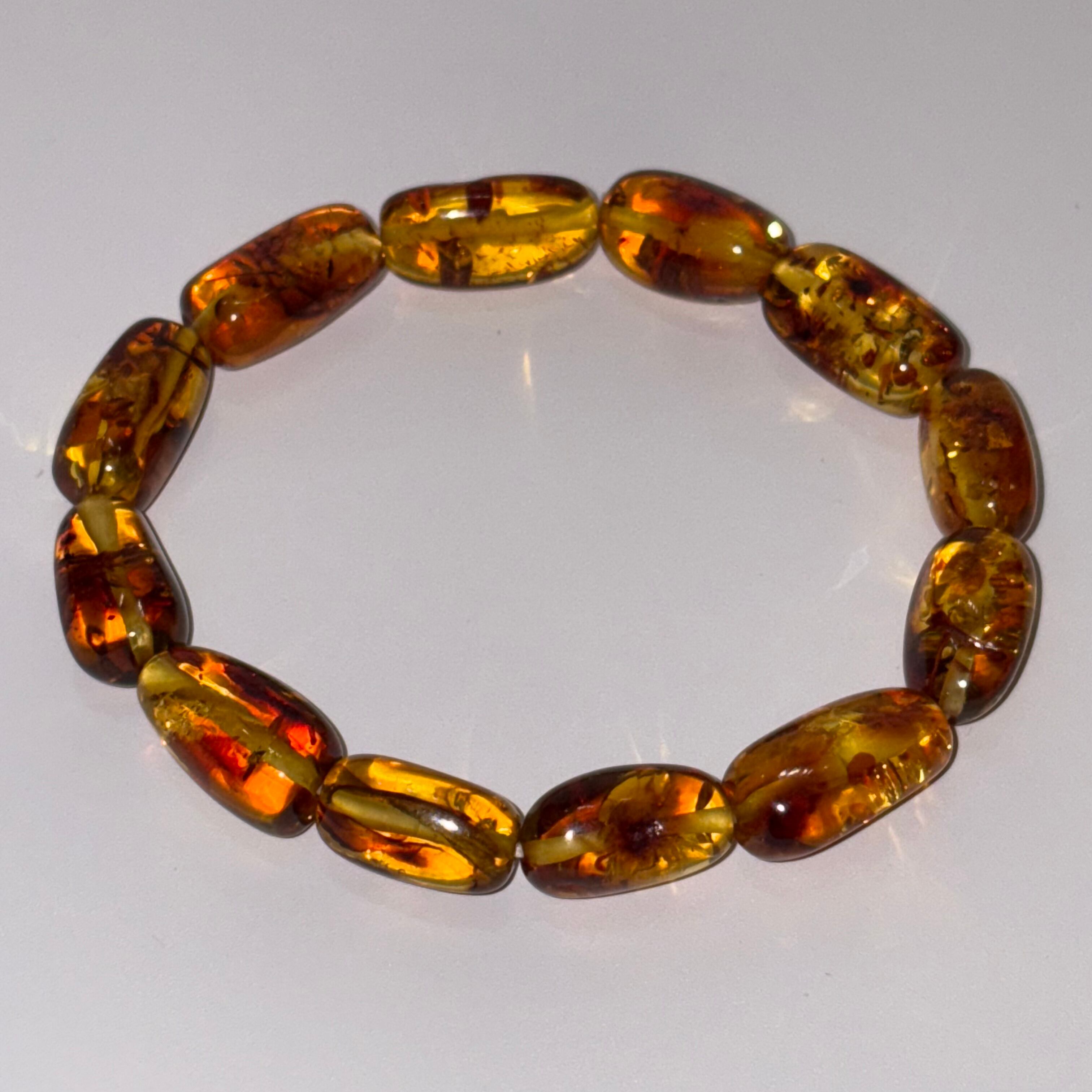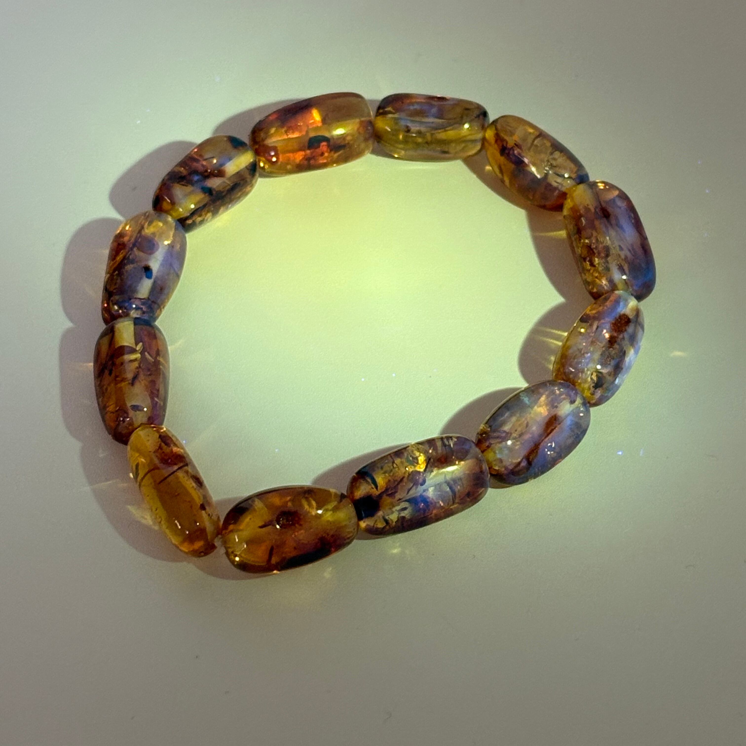 琥珀(アンバー)は、数百万年以上前の樹脂が化石化したもので、鉱物ではなく有機物の一種です。そのため、他の宝石とは異なり、温かみのある軽い質感を持ち、優しいエネルギーを放つことで知られています。古代から「太陽の石」として崇められ、幸運や健康をもたらすお守りとして愛されてきました。 特にヨーロッパやアジアでは、病気を防ぎ、生命力を高める力があると信じられています。画像の最後はUVライト(ブラックライト)を当てました。青く光るのは本物の証しです。