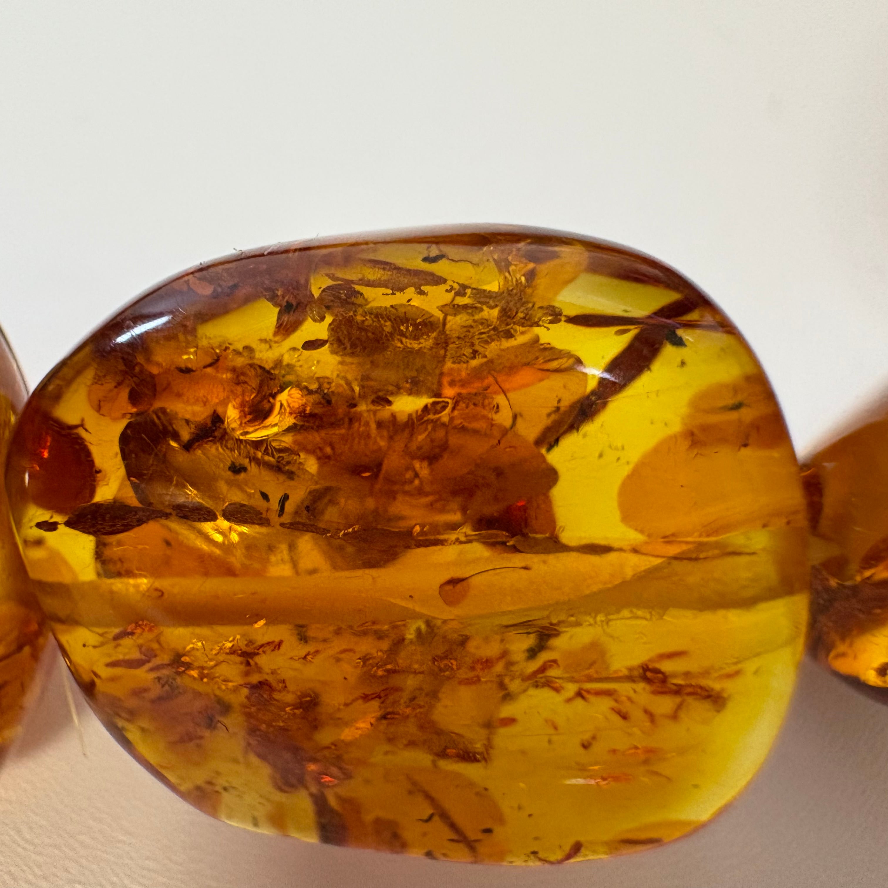 琥珀(アンバー)は、数百万年以上前の樹脂が化石化したもので、鉱物ではなく有機物の一種です。そのため、他の宝石とは異なり、温かみのある軽い質感を持ち、優しいエネルギーを放つことで知られています。古代から「太陽の石」として崇められ、幸運や健康をもたらすお守りとして愛されてきました。 特にヨーロッパやアジアでは、病気を防ぎ、生命力を高める力があると信じられています。画像の最後はUVライト(ブラックライト)を当てました。青く光るのは本物の証しです。