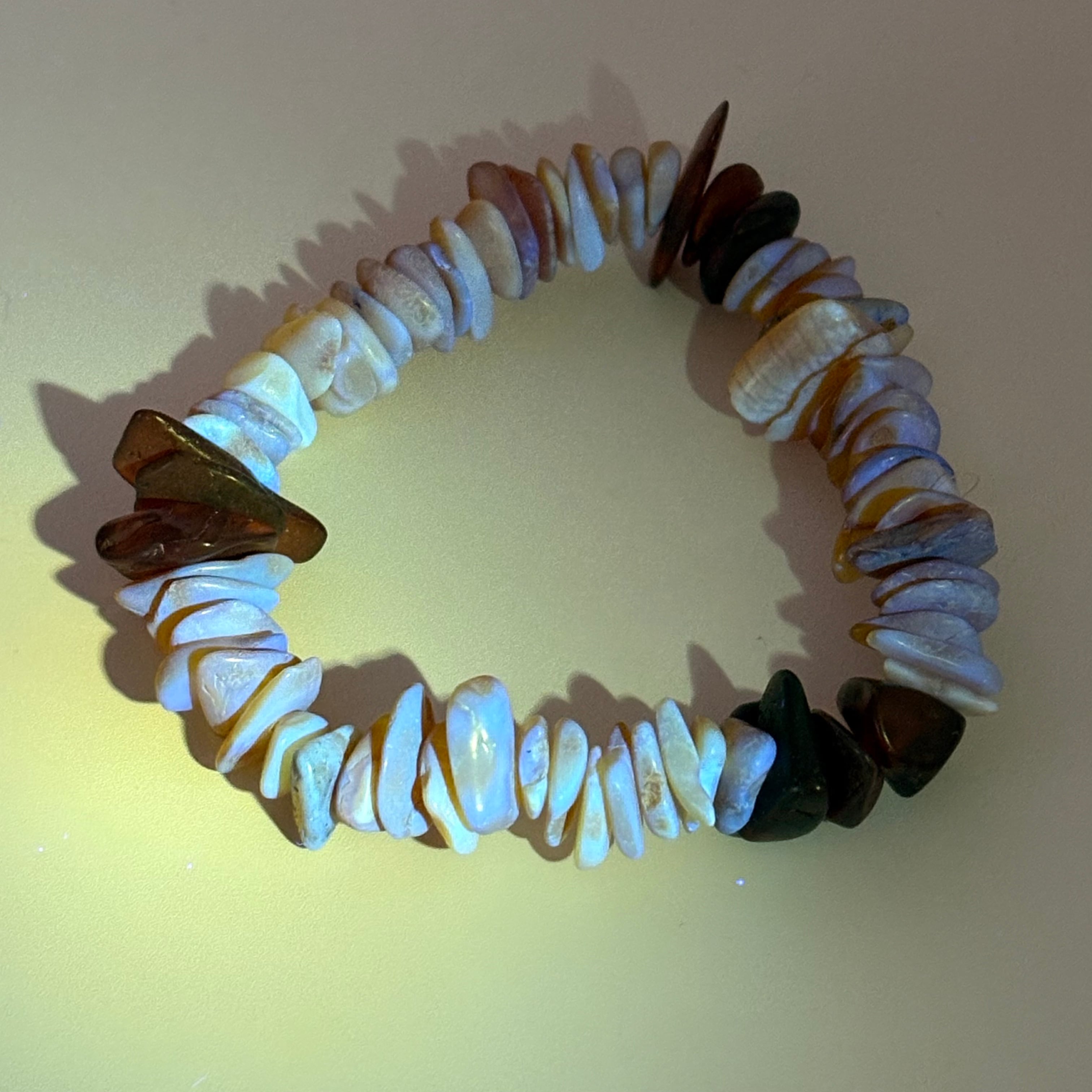 琥珀(アンバー)は、数百万年以上前の樹脂が化石化したもので、鉱物ではなく有機物の一種です。そのため、他の宝石とは異なり、温かみのある軽い質感を持ち、優しいエネルギーを放つことで知られています。古代から「太陽の石」として崇められ、幸運や健康をもたらすお守りとして愛されてきました。 特にヨーロッパやアジアでは、病気を防ぎ、生命力を高める力があると信じられています。画像の最後はUVライト(ブラックライト)を当てました。青く光るのは本物の証しです。